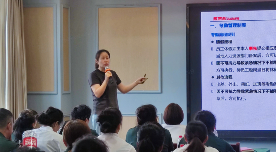 人力资源管理中心员工关系部胡吉艳经理与大家分享考勤管理及公司人力制度、红线规则,帮助大家了解在企业做事规则和行为要求。