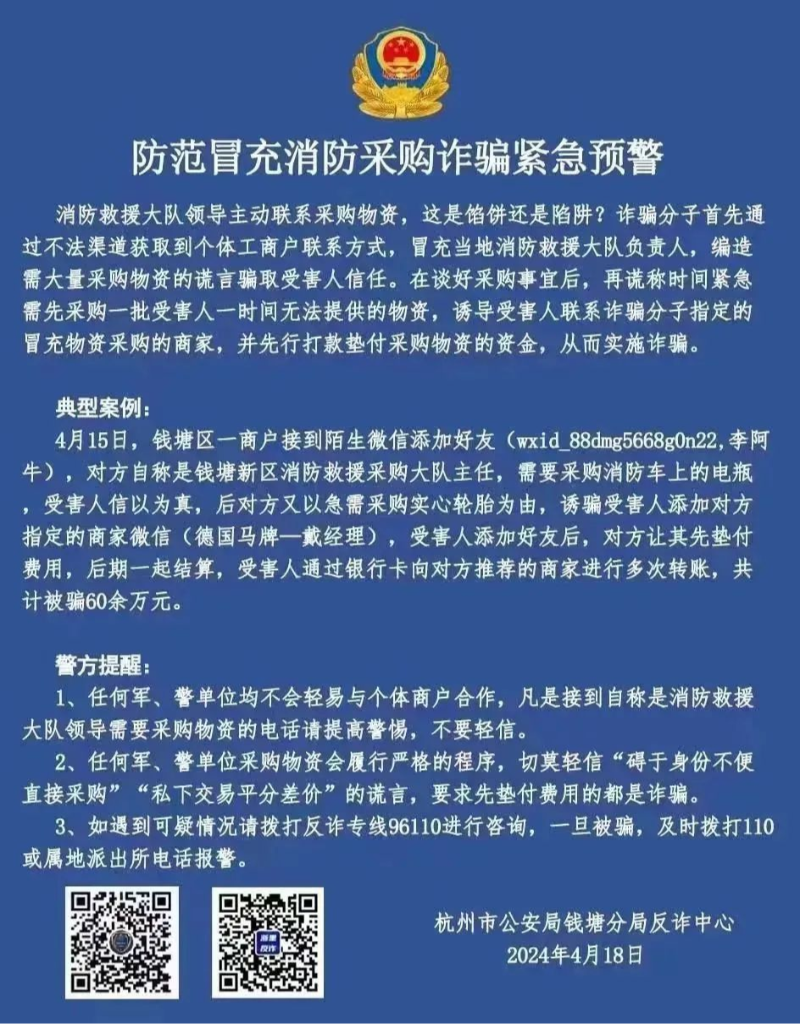 2024年4月15日,杭州钱塘区一商户接到陌生微信添加好友,对方自称是钱塘新区消防救援采购大队主任,需要采购消防车上的电瓶,受害人信以为真后,对方又以急需采购实心轮胎为由,诱骗受害人添加对方指定的商家微信,受害人添加好友后,通过银行卡向对方推荐的商家,进行多次转账,共计被骗60余万元。