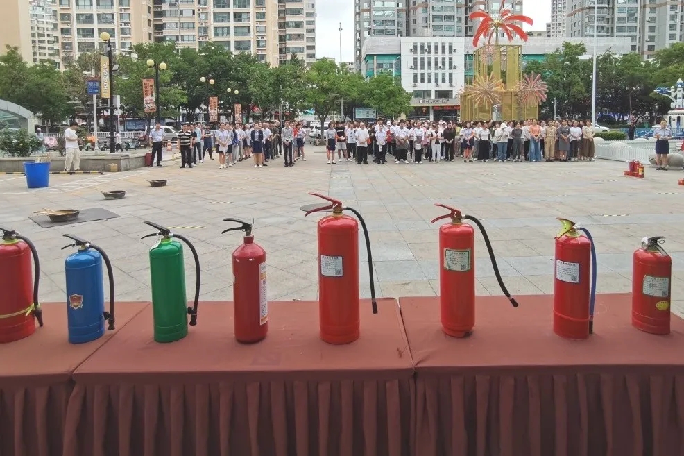 当最后 1 名员工安全离开大楼,疏散逃生演练圆满结束。随后,所有参演人员迅速聚集在九龙城北广场,集中观看警示安全教育片。在观看结束后,九龙城义务消防队对灭火器、消火栓、过滤式自救呼吸器等装备进行了现场讲解和演示,员工代表积极参与亲自上阵操作干粉灭火器、水基型灭火器并使用过滤式自救呼吸器。通过亲身实践,员工们不仅熟练掌握了灭火操作方法,更大大提升了火灾处置能力。