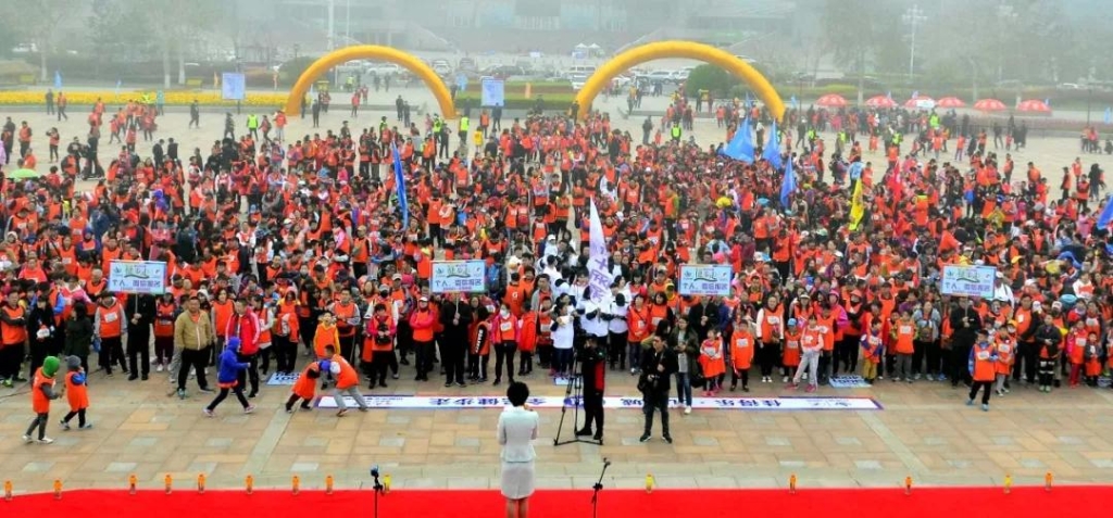 4月22日上午,在威海公园中心文化广场,数千名威海的市民从四面八方聚集于此,参加第五届家家悦九龙城·佳得乐杯全民健身运动赛,亲自用脚步丈量最美海岸线,捐出自己的一份爱!