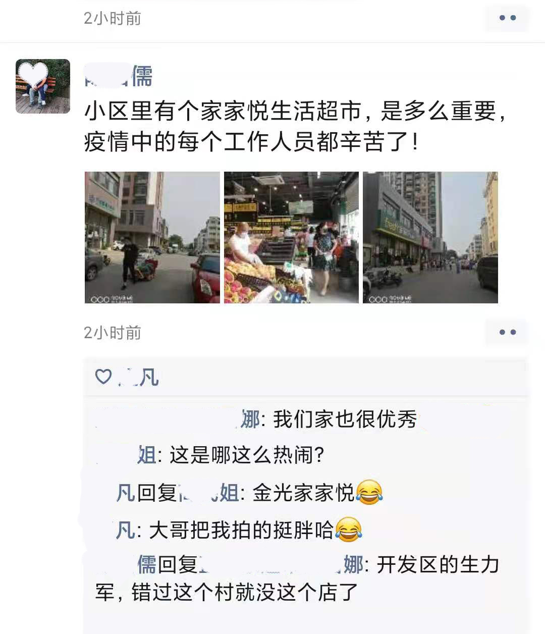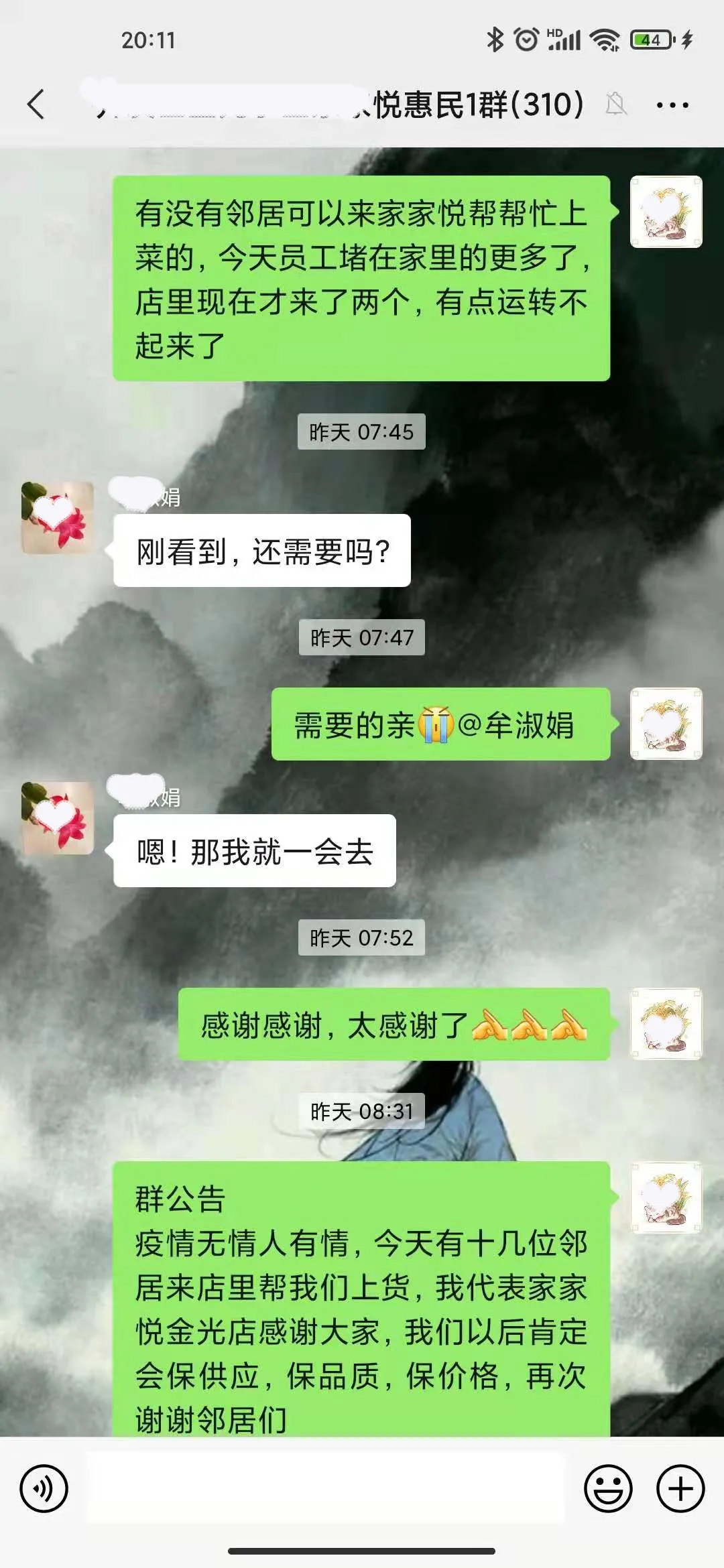 家家悦一直坚持做居民的好邻居、当家庭的好帮手,面对疫情突发、员工无法到岗、平常5倍来货量的时刻,是邻里互助让金光店度过了难关。店长说:“感谢金光小区的邻居们,大家的信任和支持,给了我们更大的力量。我们会用诚信回馈顾客的信任,用更好的商品、更优的服务,做好疫情期间的市场保供工作,与大家共同度过这次难关”!