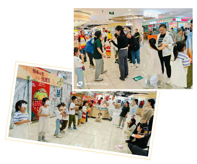 分会场创意互动,活动氛围也很热烈。除了风车灯笼DIY以外,还组织亲子蒙眼吃月饼的环节。在蒙眼投喂挑战中,孩子们需蒙眼并成功喂给家长,既增进亲子默契,又凸显中秋“分享团圆”的主题。所有活动均围绕传统文化创新设计,旨在让参与家庭在趣味中深化对节日内涵的理解。