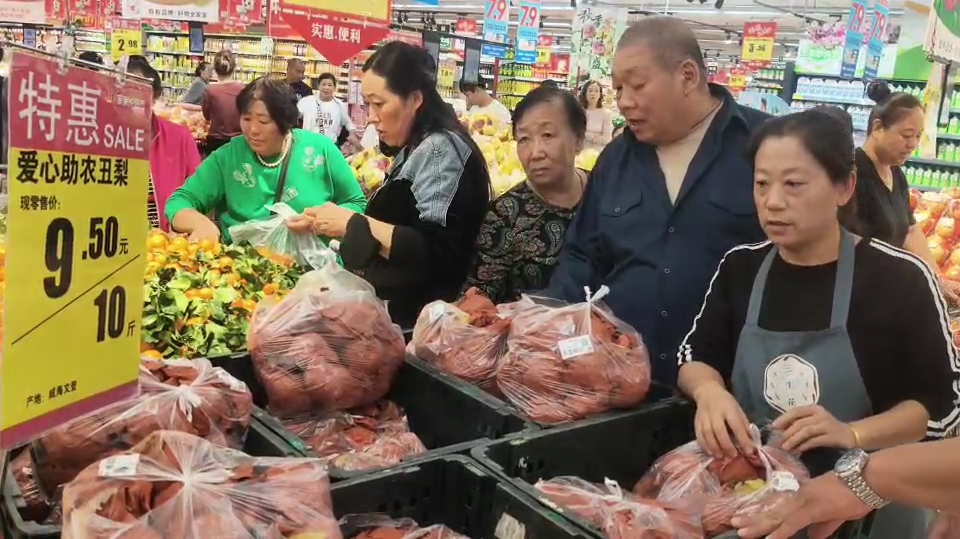 当晚,5万斤丑梨被分批采摘运送至家家悦威海物流中心,经过连夜分拣、筛选和包装,于次日凌晨发往威海各区县门店。17日一早,丑梨已整齐陈列在货架上,全部低于采购价销售,真正做到助农惠民。