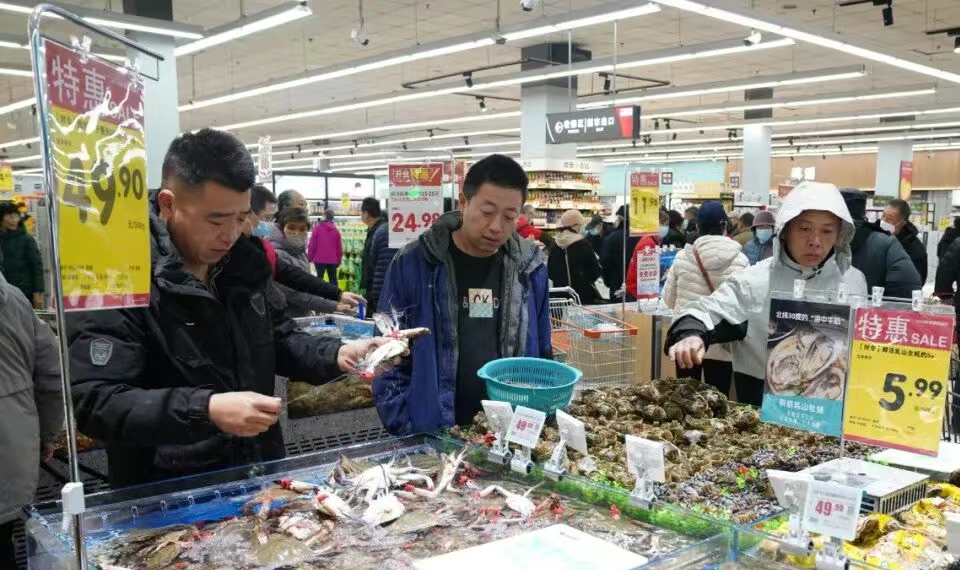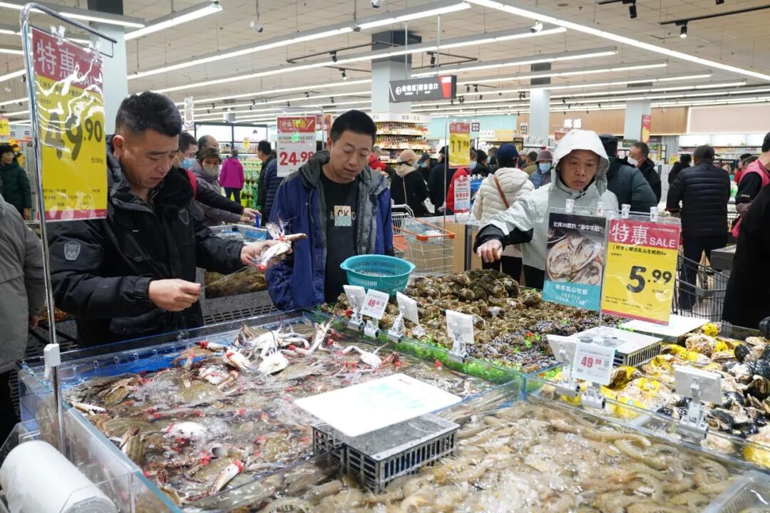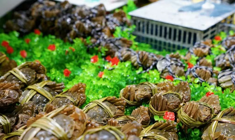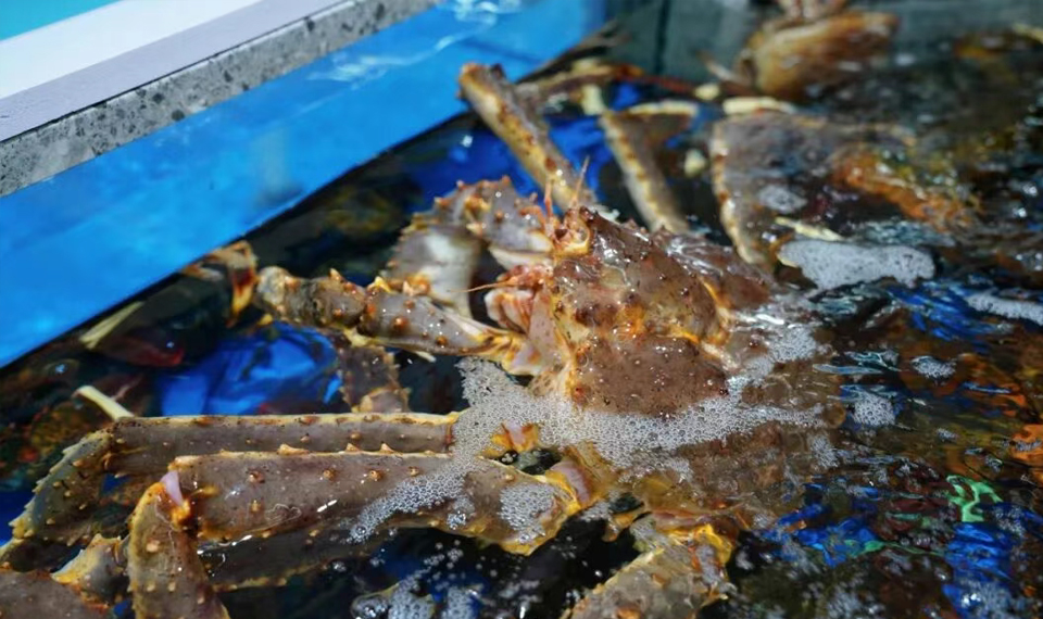 鲜活帝王蟹挥着蟹钳 “打招呼”